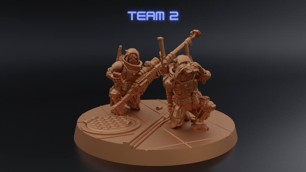 These miniatures will fit perfectly on 60mm round bases in case of the teams, though the sniper can be put on an oval base separately if that is what you prefer.